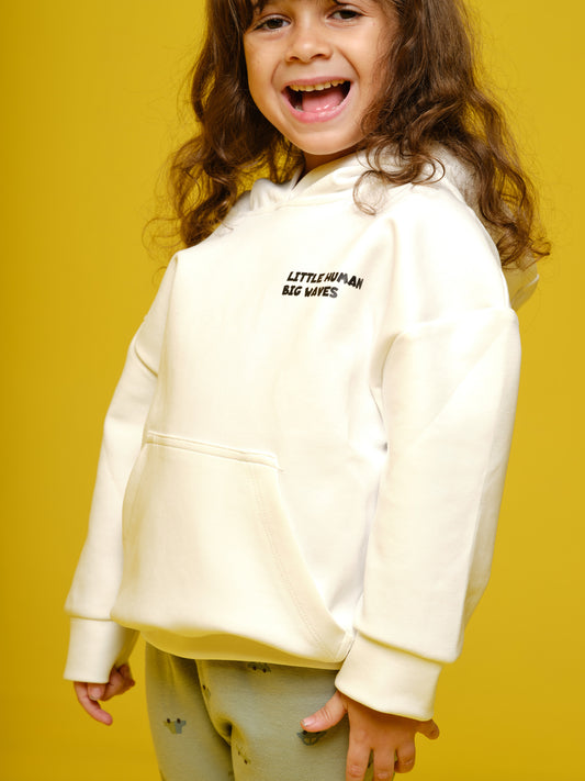 Boys White Hoodie "little human, big waves'